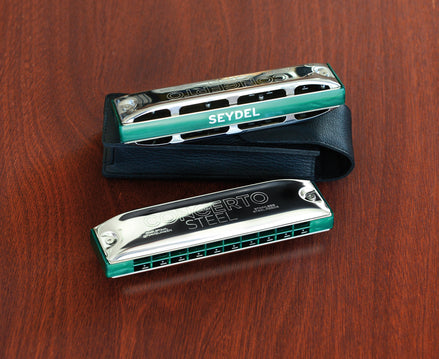 The CONCERTO STEEL is a high-grade octave-tuned double-reed diatonic. The notes are arranged exactly like on a 10-hole diatonic (Richter tuning).